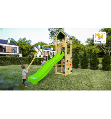 Équipée d’une plateforme à 116 cm de hauteur, d’un mur d’escalade, d’un toboggan vert de 220 cm et de deux balançoires aux sièges rouges, la station CHARLY permet aux enfants de grimper, glisser et se balancer sans jamais s’ennuyer. Les plus petits profiteront également d’un bac à sable situé au pied de la tour, parfait pour créer châteaux et histoires imaginaires. Une toiture vient compléter l’ensemble pour encore plus de confort et de jeu.